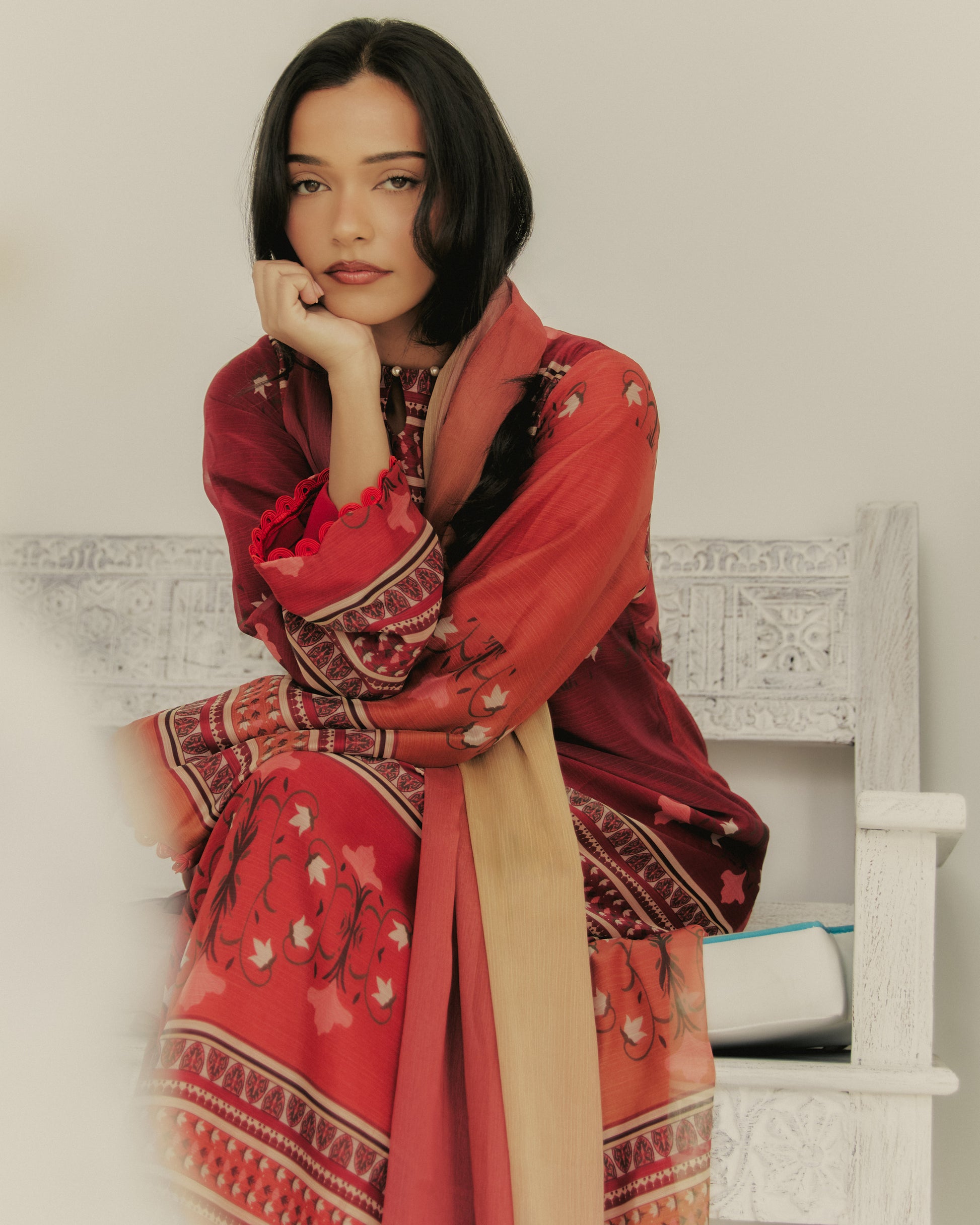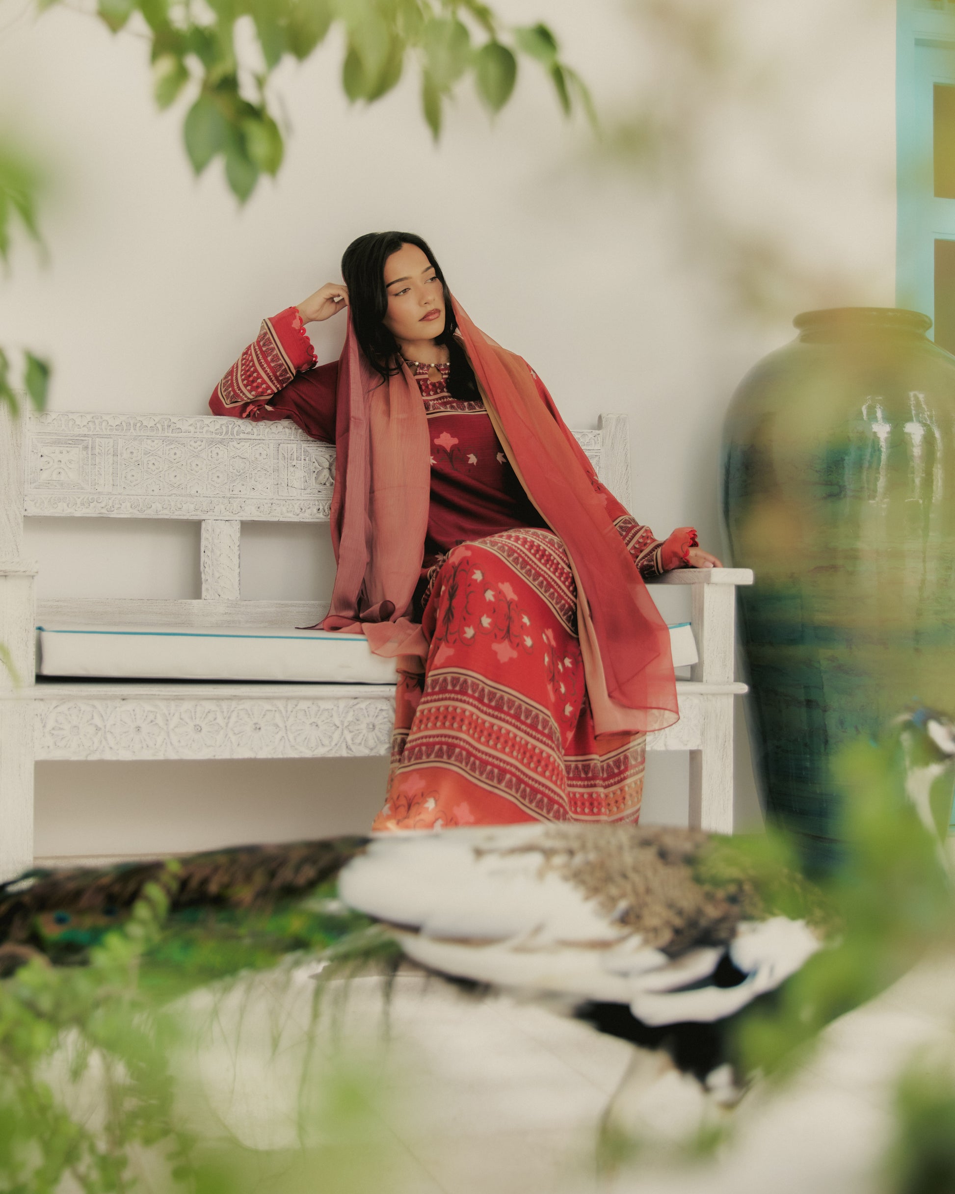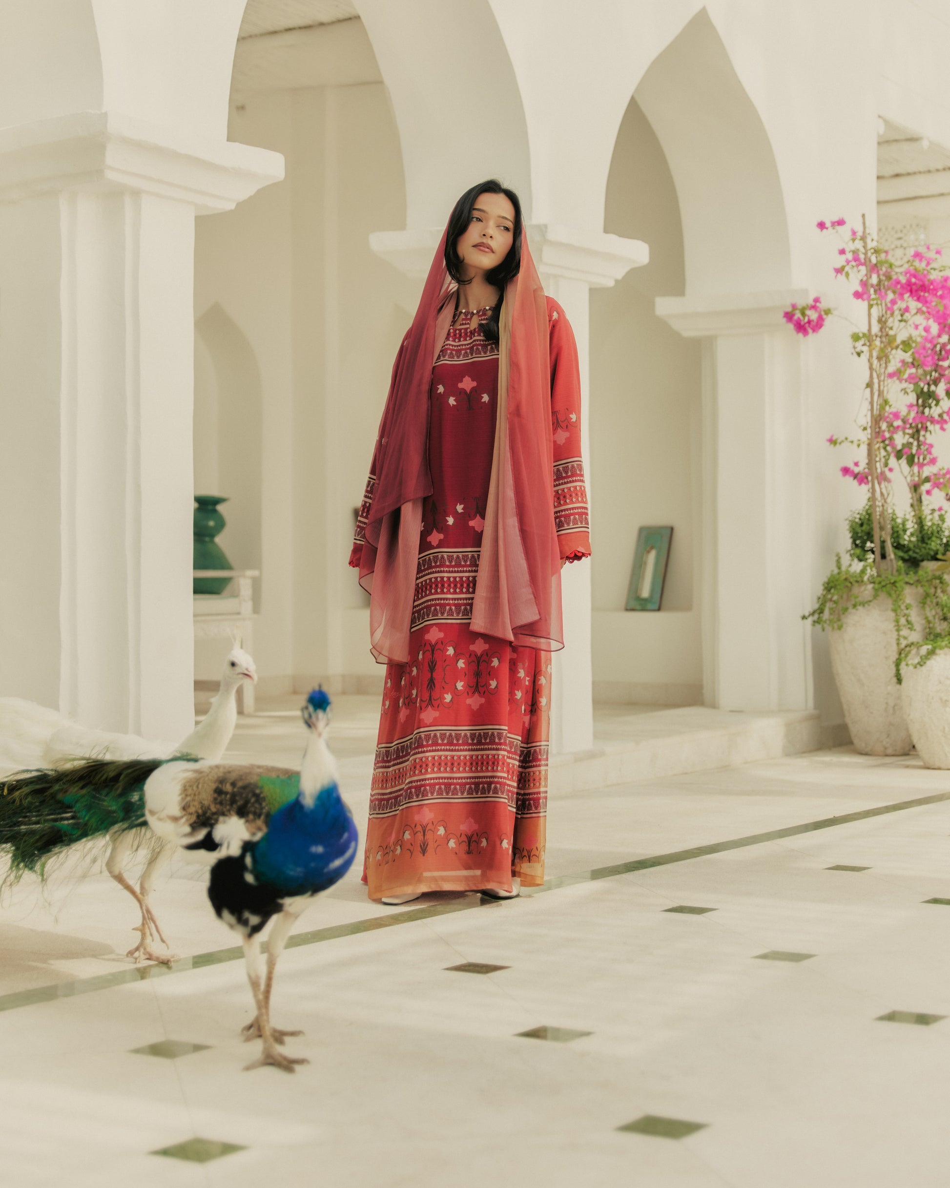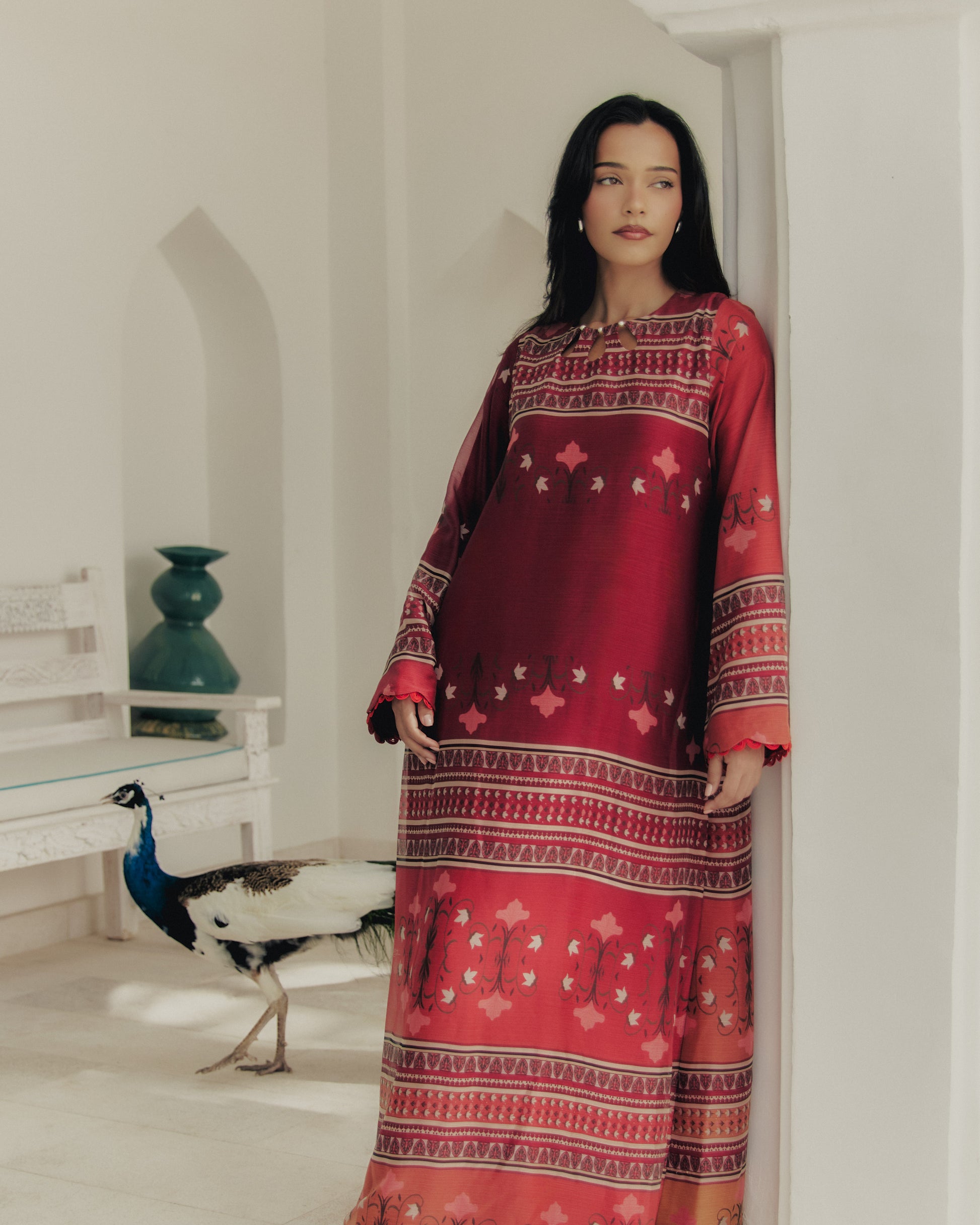 The Layali Garnet Ramadan Jalabiyya is defined by a relaxed silhouette and rich, ornamental detailing. Crafted from lightweight fabric, it features layered geometric and floral motifs arranged in soft horizontal bands, creating visual rhythm and depth. The warm garnet tone adds a timeless elegance, while the wide sleeves and fluid cut ensure comfort throughout Ramadan evenings.