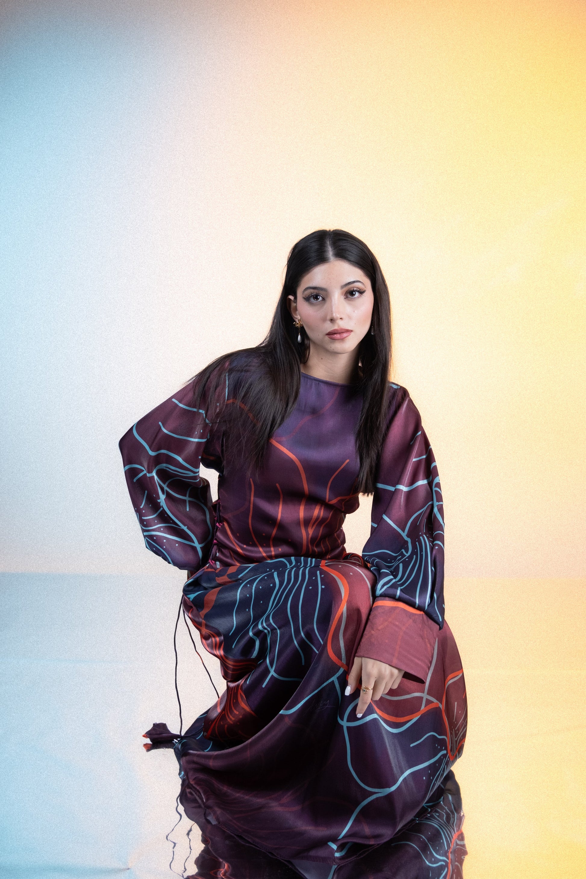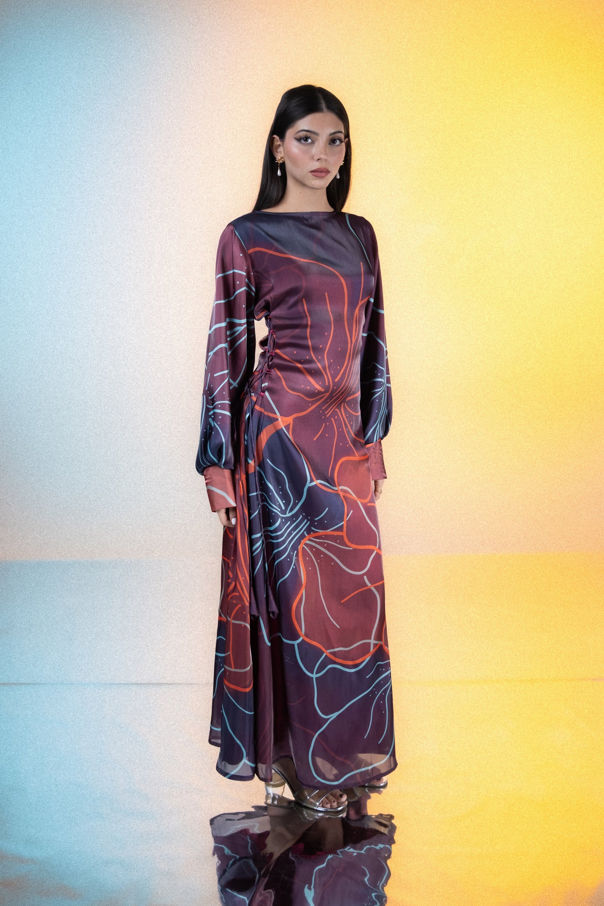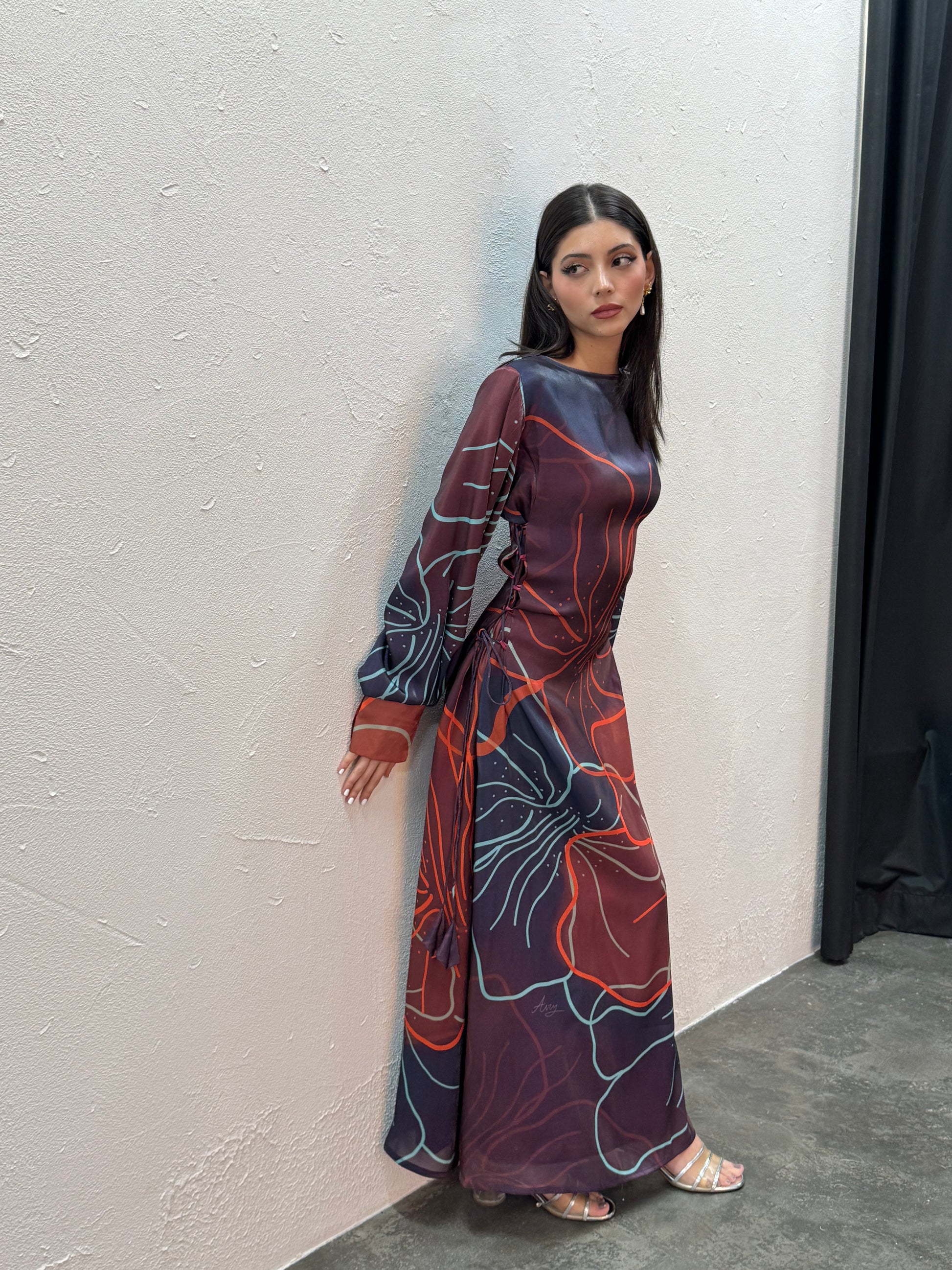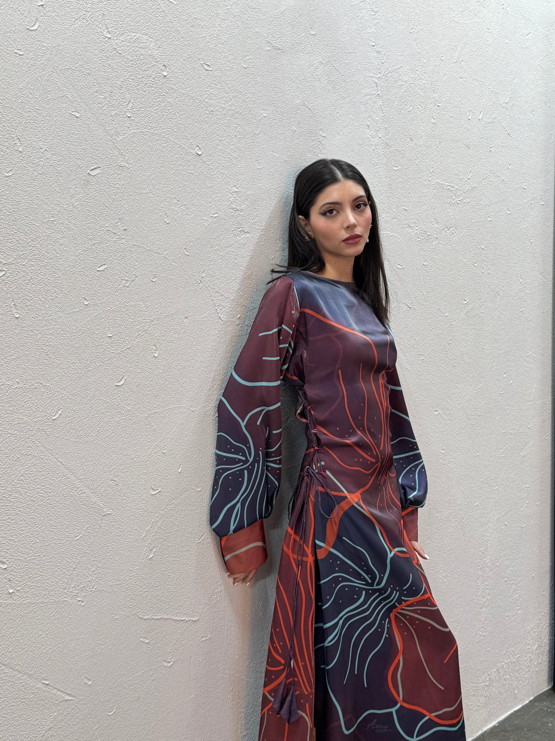A statement piece crafted in airy silk with a bold oversized floral print that wraps dramatically across the body. The side ruching adds shape and movement, while the balloon sleeves and subtle satin lining give it a refined edge.