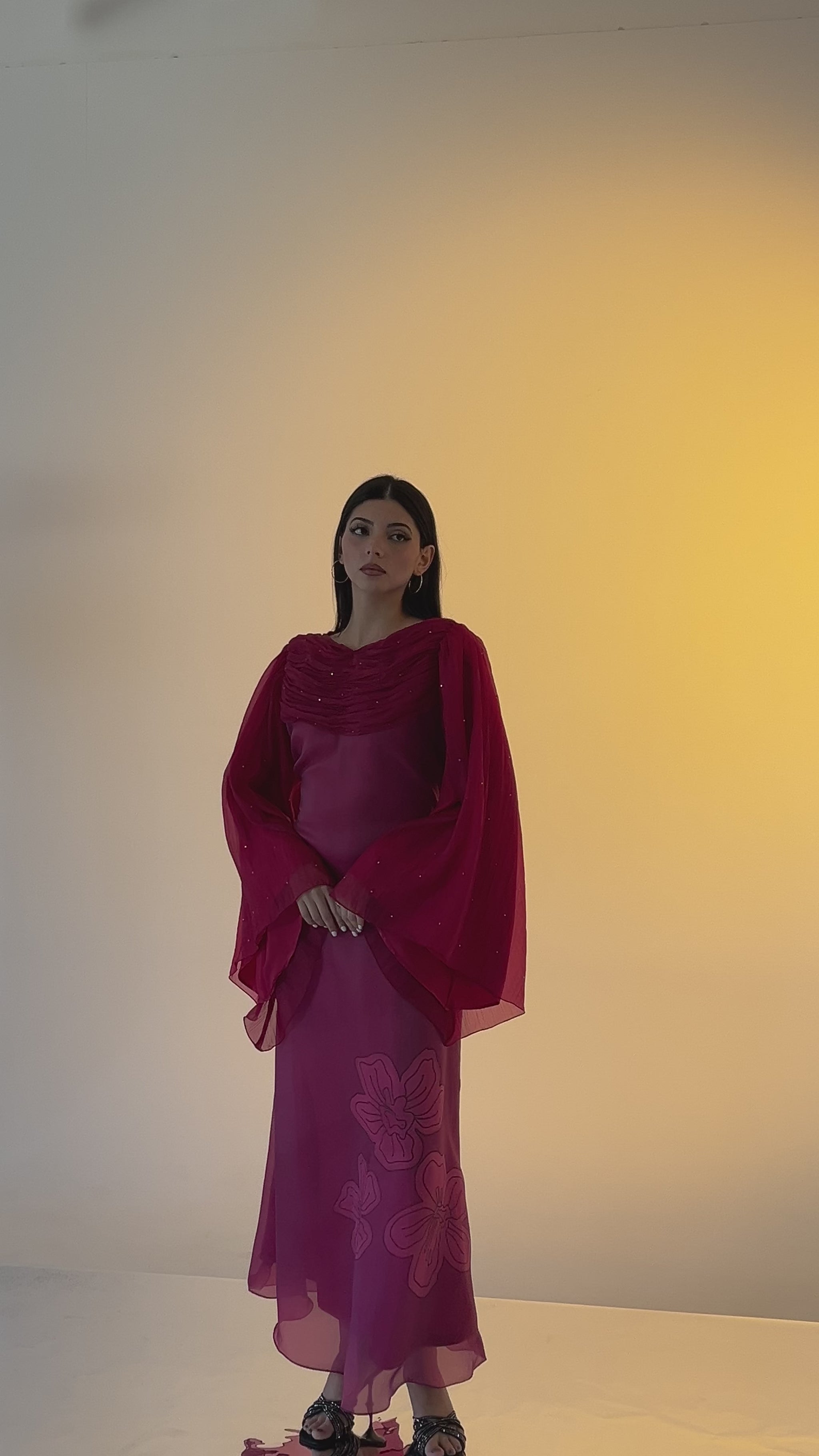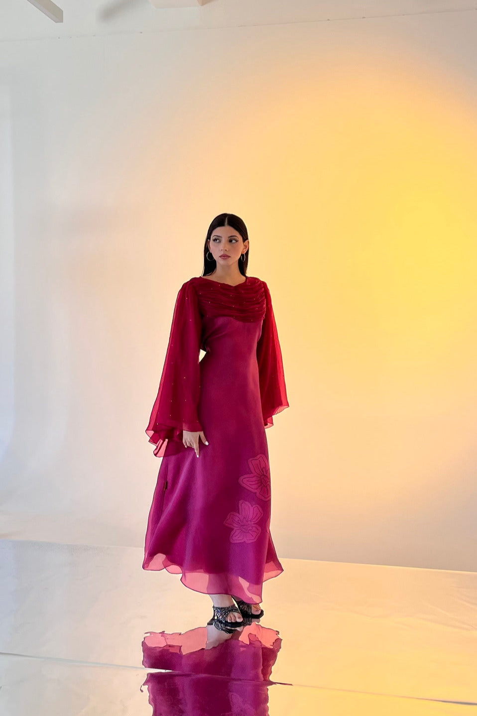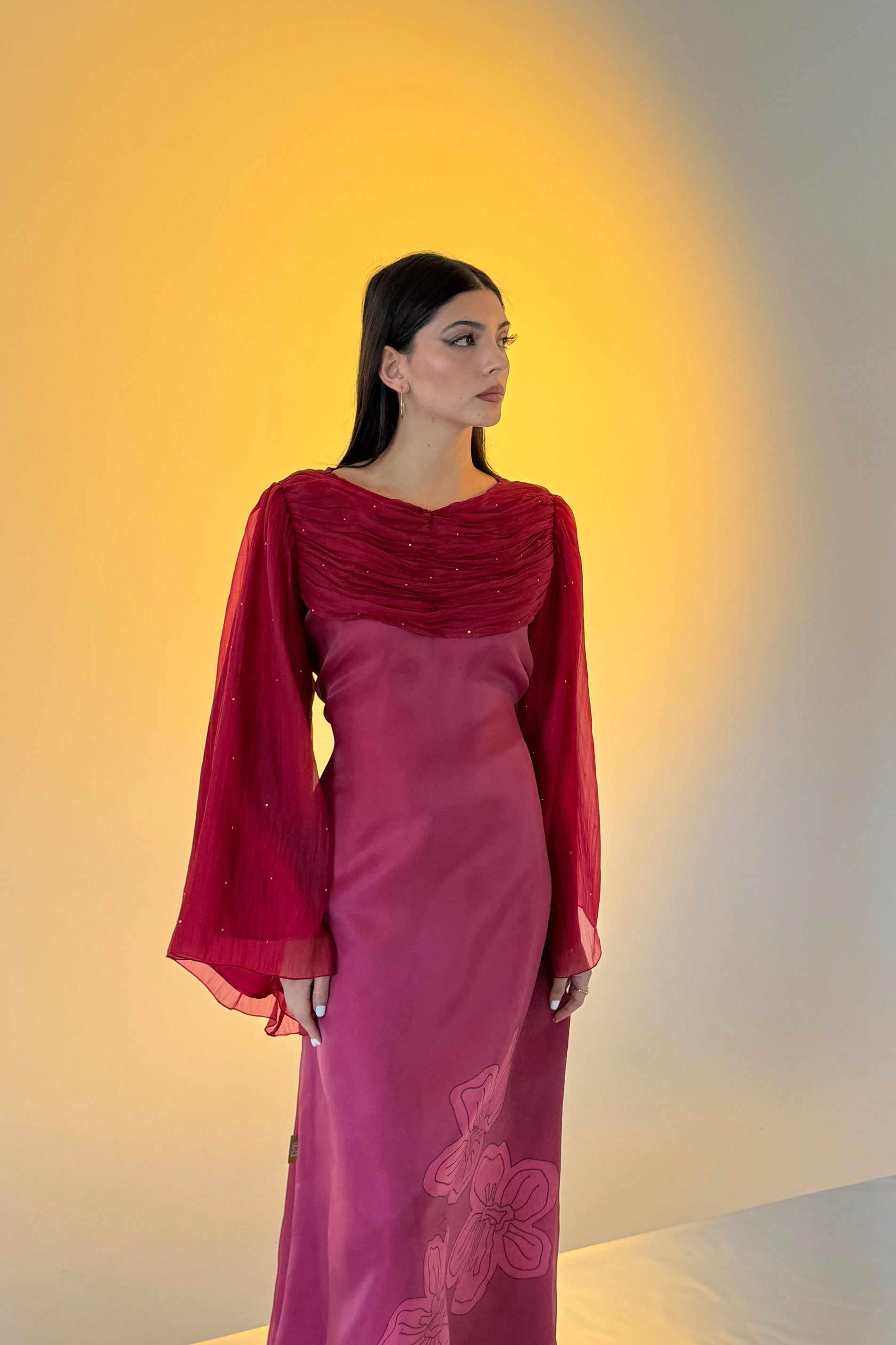 A romantic, flowy custom printed dress in a rich berry tone, featuring a draped sheer neckline and softly pleated sleeves. The bottom is adorned with oversized sketched sakura, adding a playful yet elegant finish.