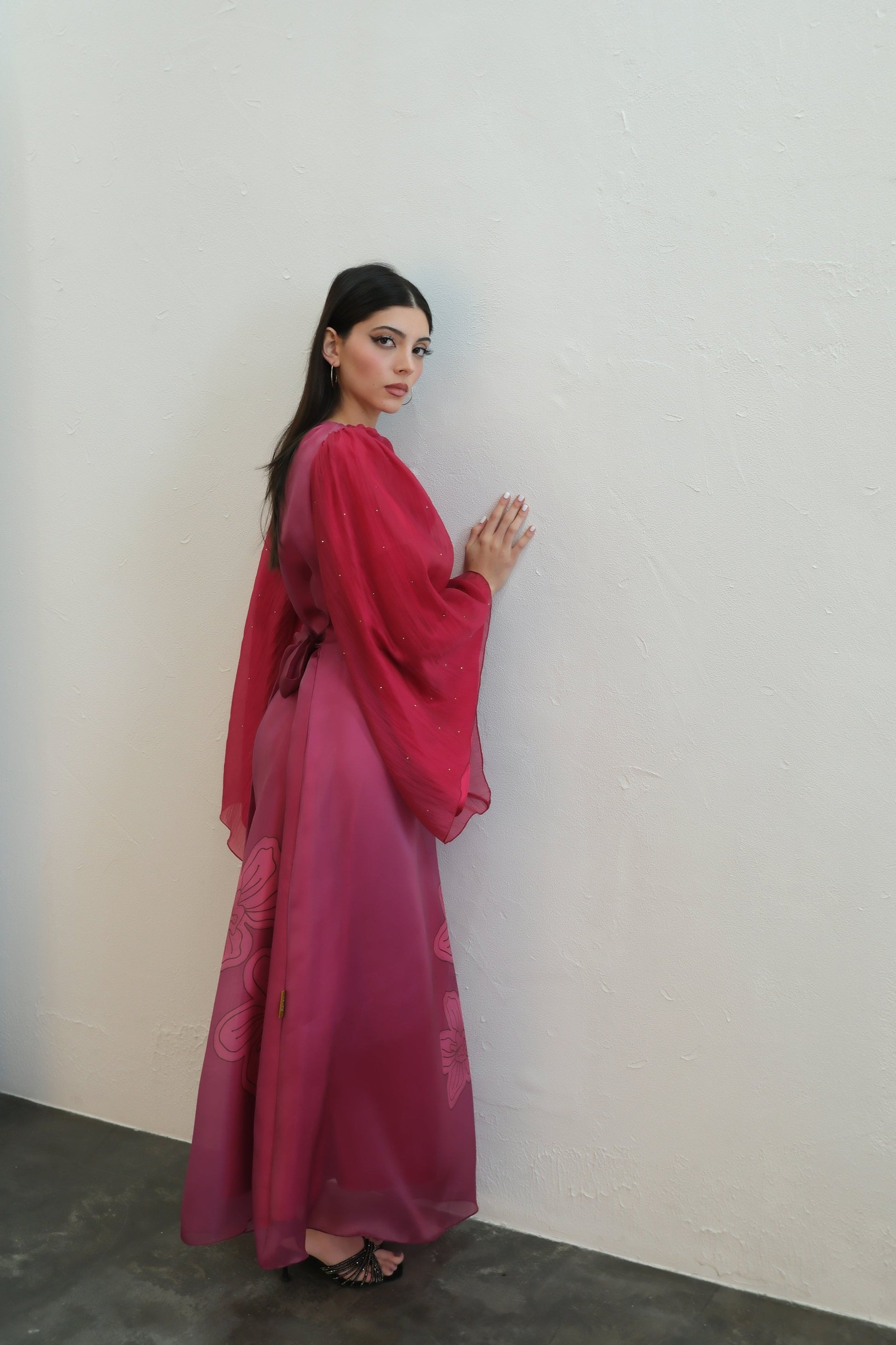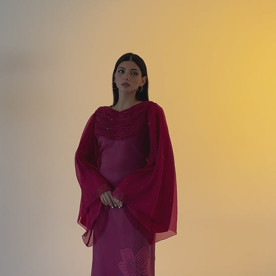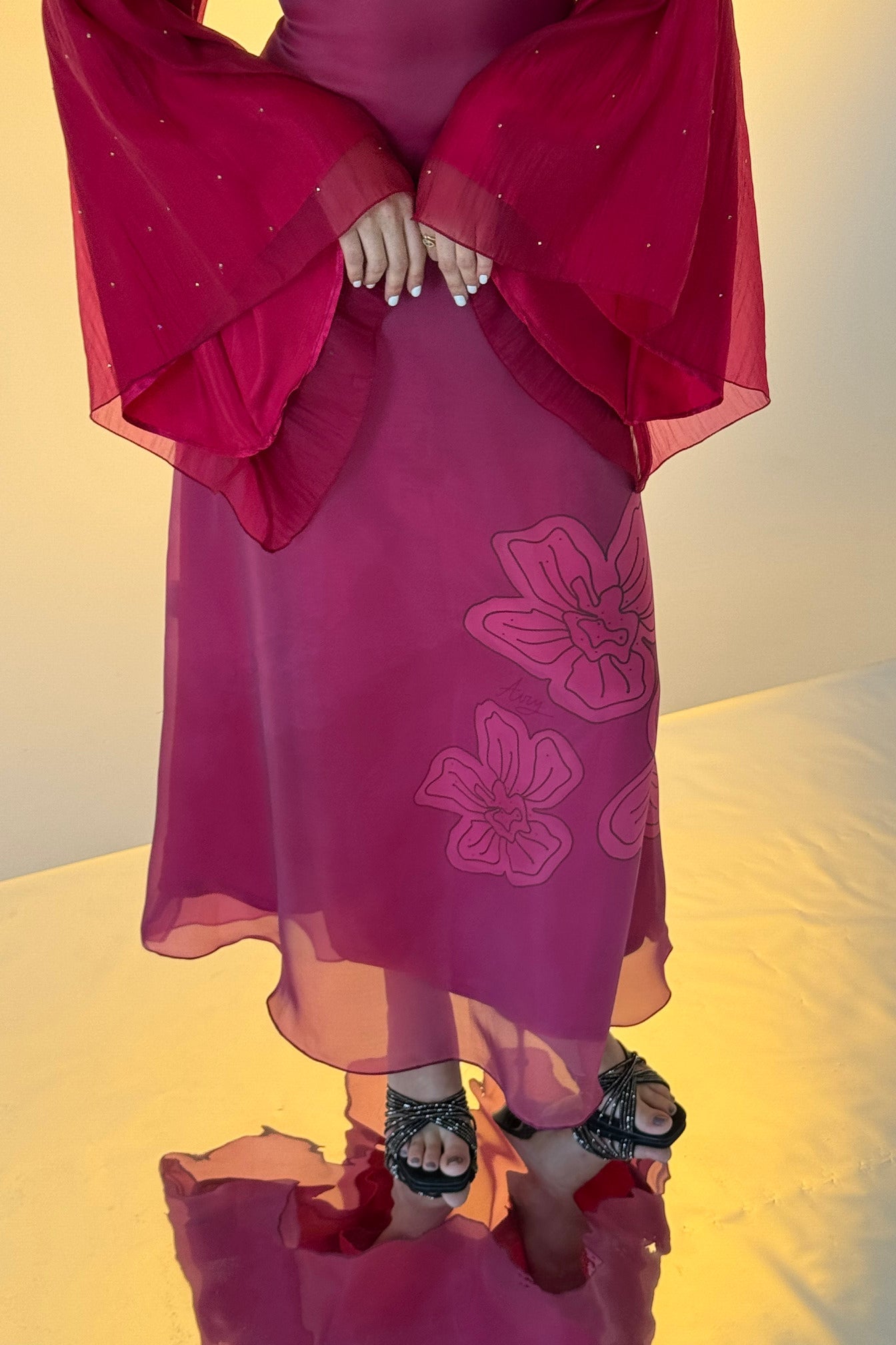 A romantic, flowy custom printed dress in a rich berry tone, featuring a draped sheer neckline and softly pleated sleeves. The bottom is adorned with oversized sketched sakura, adding a playful yet elegant finish.