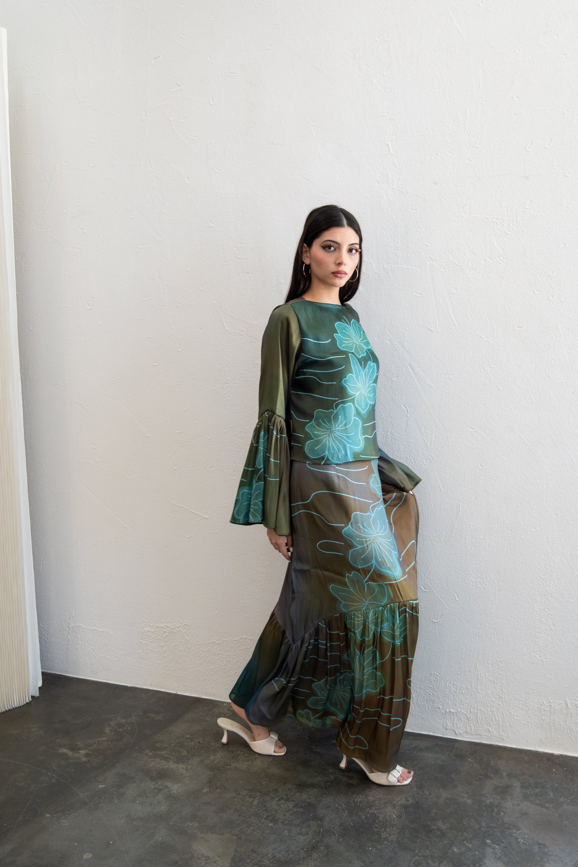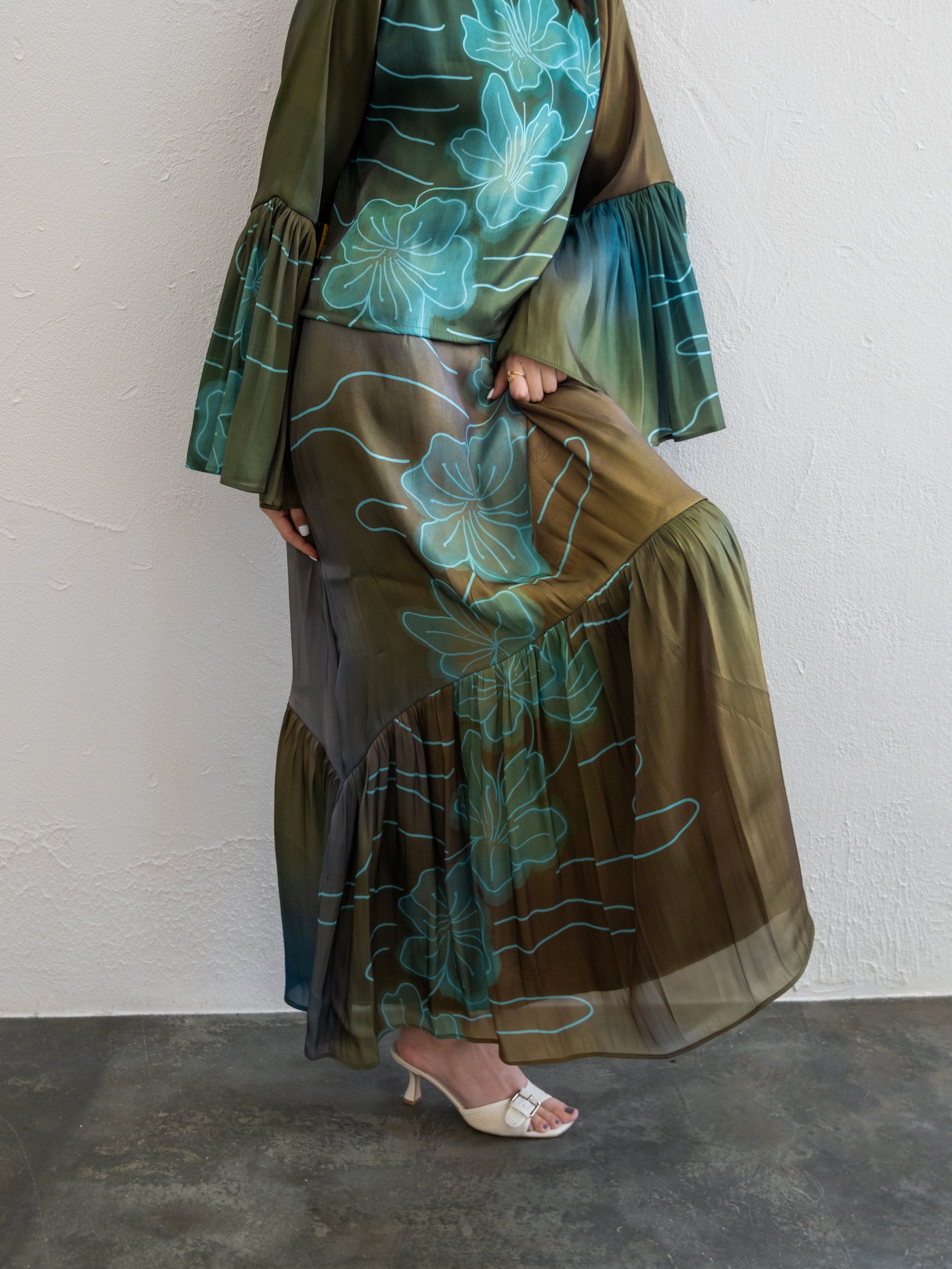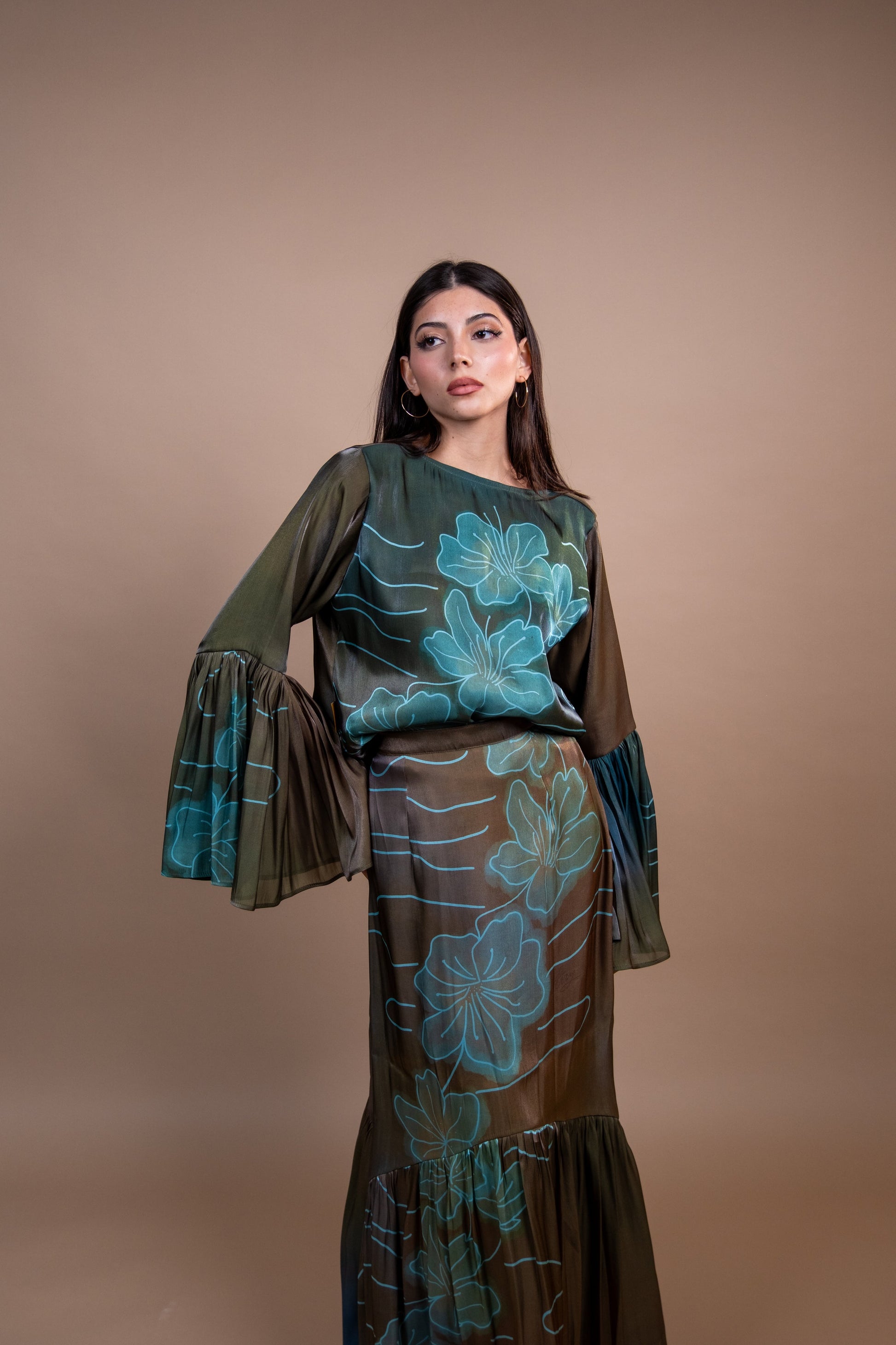 A bold yet breezy set made to move with you. Features a flowy top with dramatic tiered sleeves and a matching high-waisted skirt, both adorned with Airy's custom oversized floral print in turquoise. The earthy olive base gives it depth, while the sheer finish keeps it light and effortless. Perfect for summer gatherings or Eid nights, this set blends elegance with comfort.