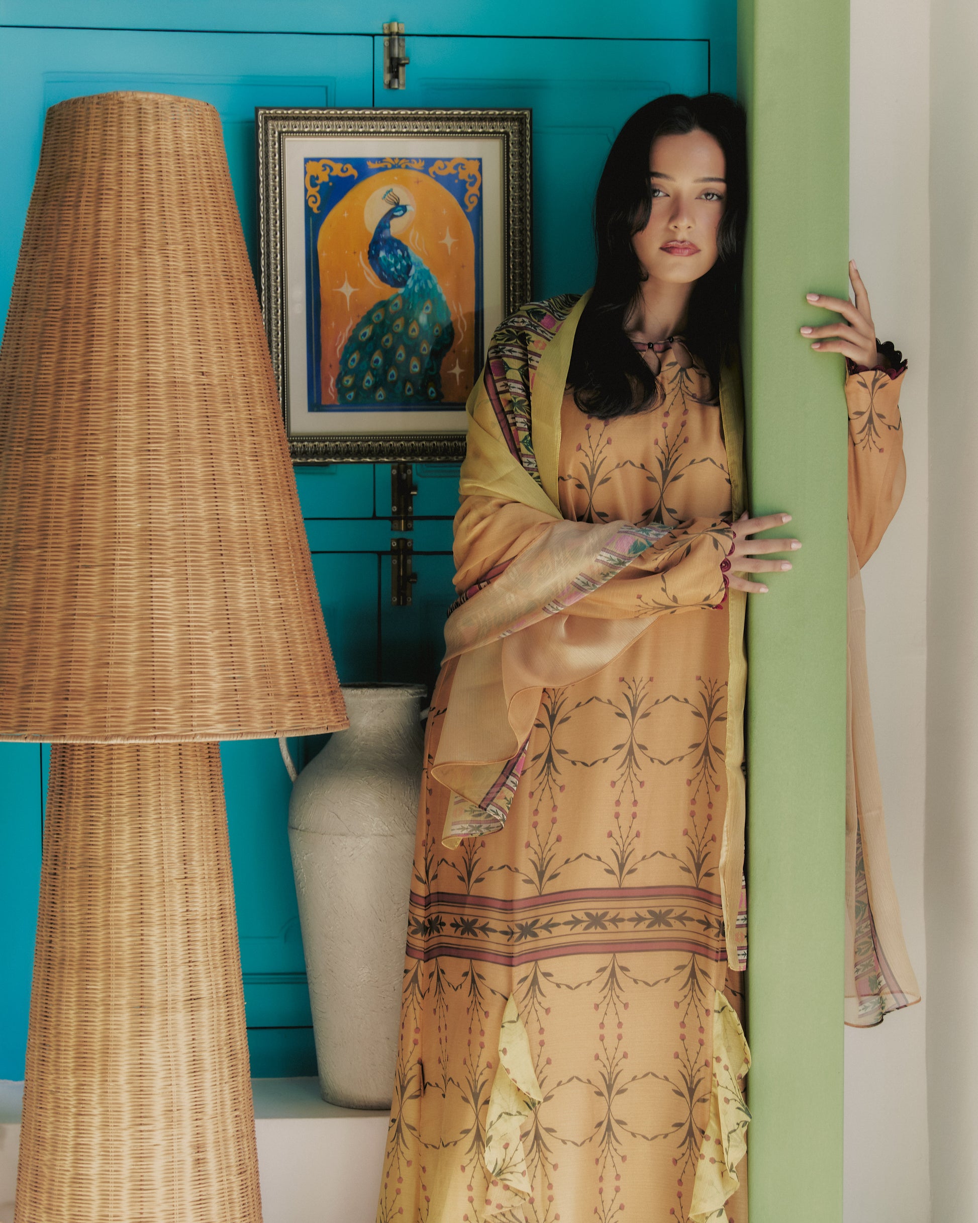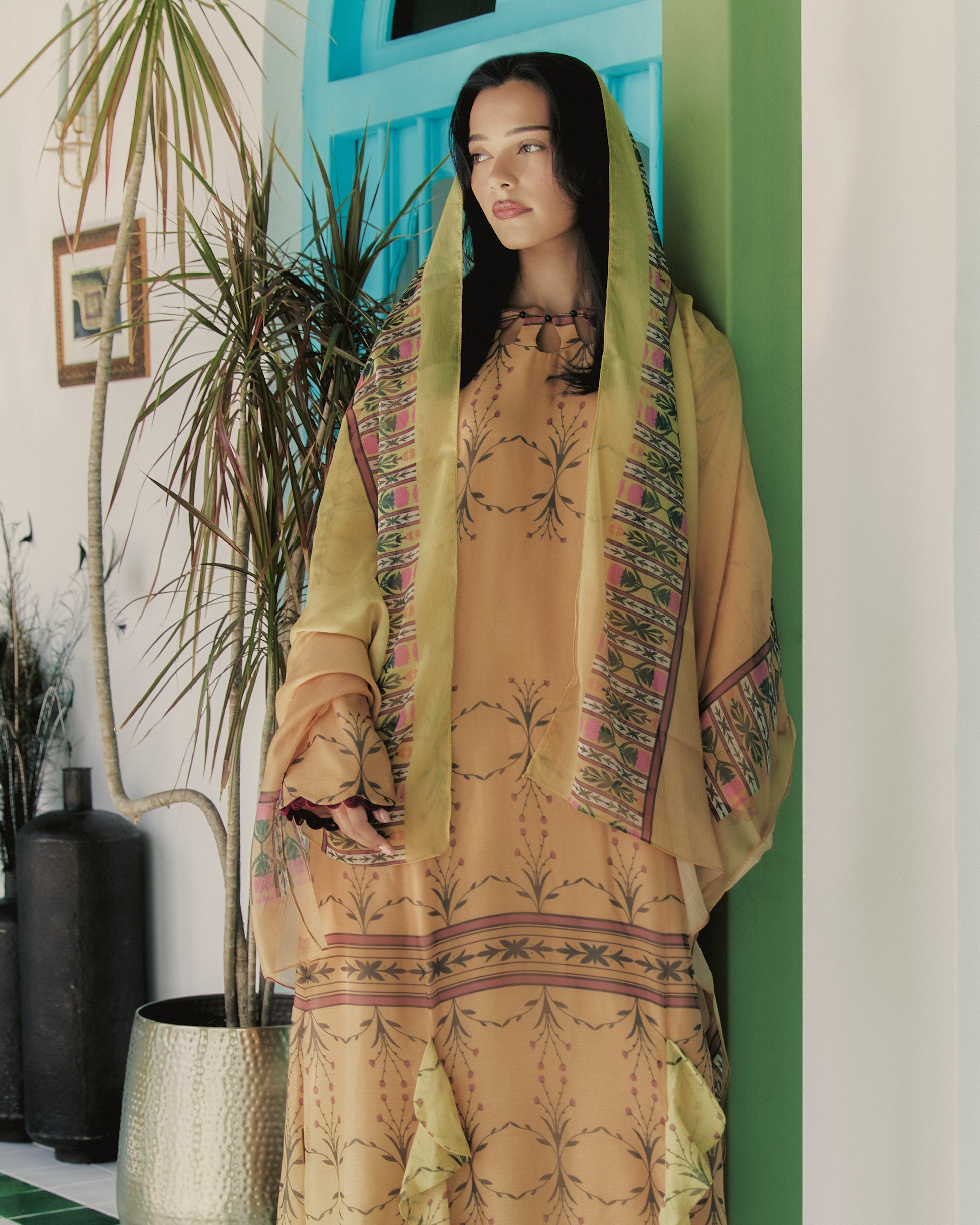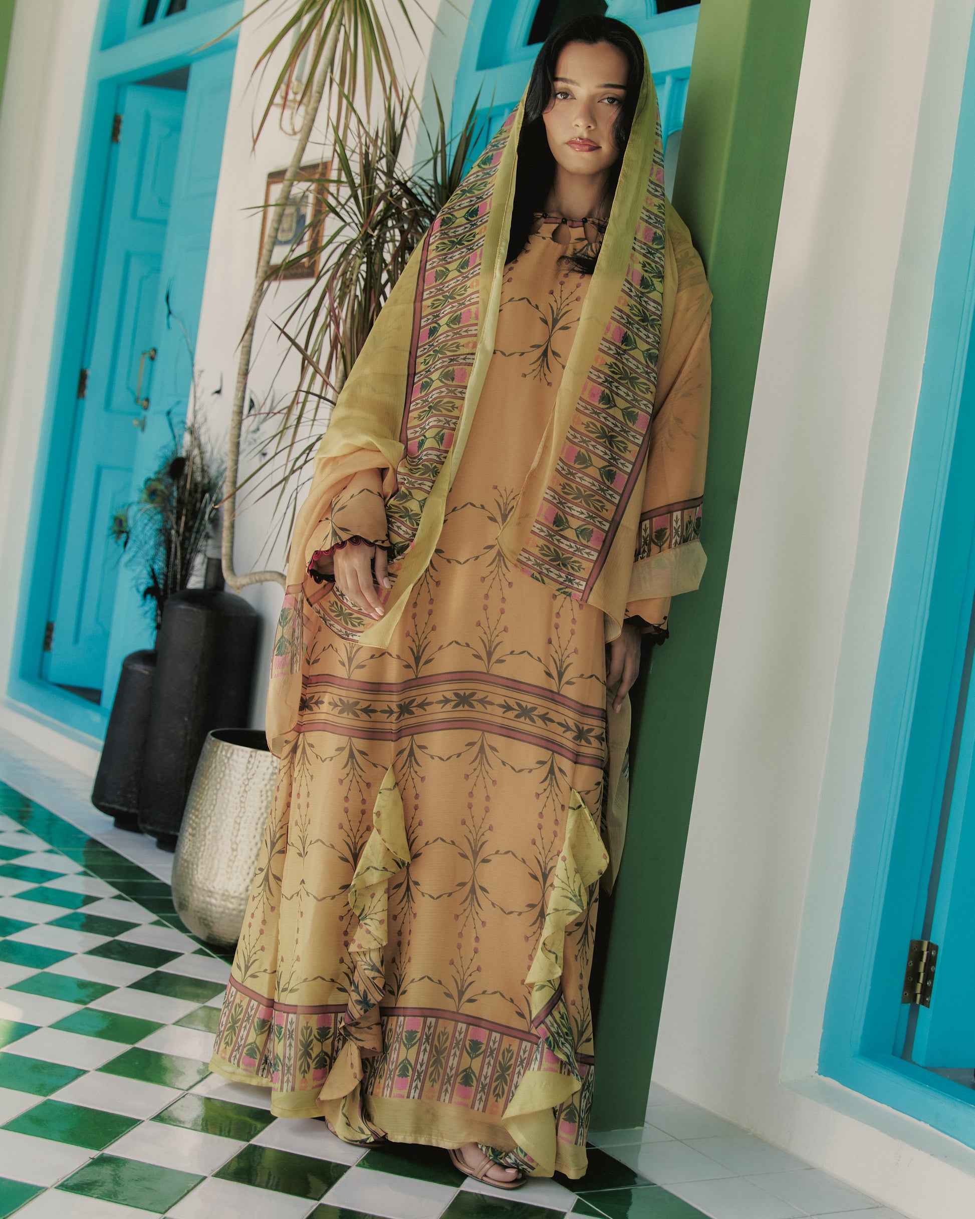 The Sukoon Amber Ramadan Jalabiyya features a relaxed, flowing silhouette designed for comfort and quiet elegance. Crafted from lightweight fabric, it is detailed with a soft botanical vine motif arranged in gentle symmetry. Delicate pearl embellishments at the neckline add a refined finish, while lace details on the hands and subtle border accents complete the design. The warm, muted tone makes it ideal for Ramadan evenings and intimate gatherings.